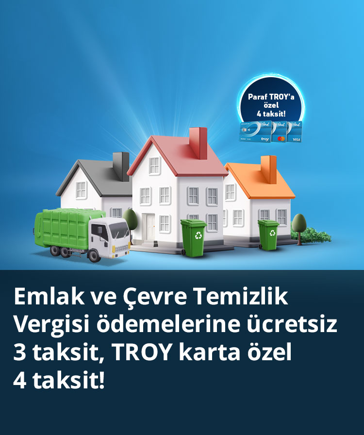 - 1 Mart - 3 Haziran 2026 tarihleri arasında yapılacak 500 TL ve 1.500.000 TL arasındaki peşin Emlak ve Çevre Temizlik Vergisi ödemeleri TROY logolu kartlar için masrafsız olarak 4 taksite, diğer kartlar için masrafsız olarak 3 taksite bölünecektir.
