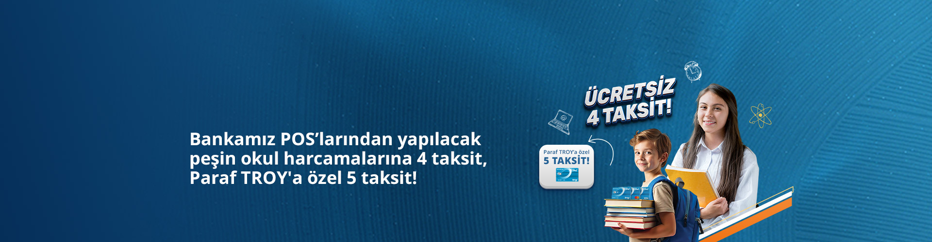 - 1-31 Aralık 2025 tarihleri arasında yurt içinde Paraf POS'larından tek seferde yapılacak 10.000 TL ile 1.000.000 TL arasındaki peşin okul ödemeleri TROY logolu kartlar için ücretsiz 5 taksite, diğer kartlar için ücretsiz 4 taksite bölünecektir.