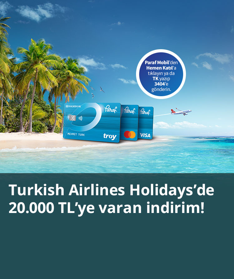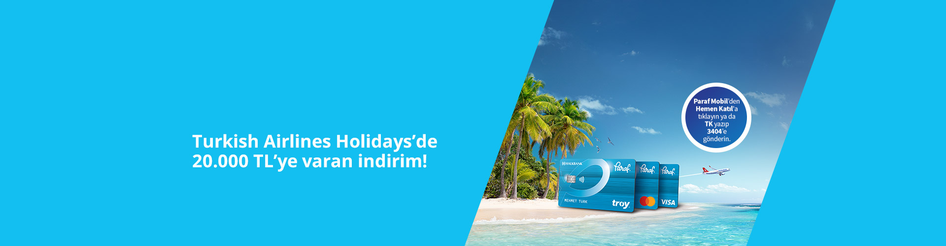 - Ticari kartlar, Business kartlar, Debit kartlar, Parafgenç, Halkcard, ParafPara kullanılarak yapılan işlemler kampanyaya dahil değildir.Turkish Airlines Holidays'de indirim ödülü başka bir indirim ödülü ile birleştirilemeyecek olup, kampanyanın farklı bir kampanya ile çakışması durumunda indirim tutarı daha büyük olan ödül karta yansıtılacaktır.