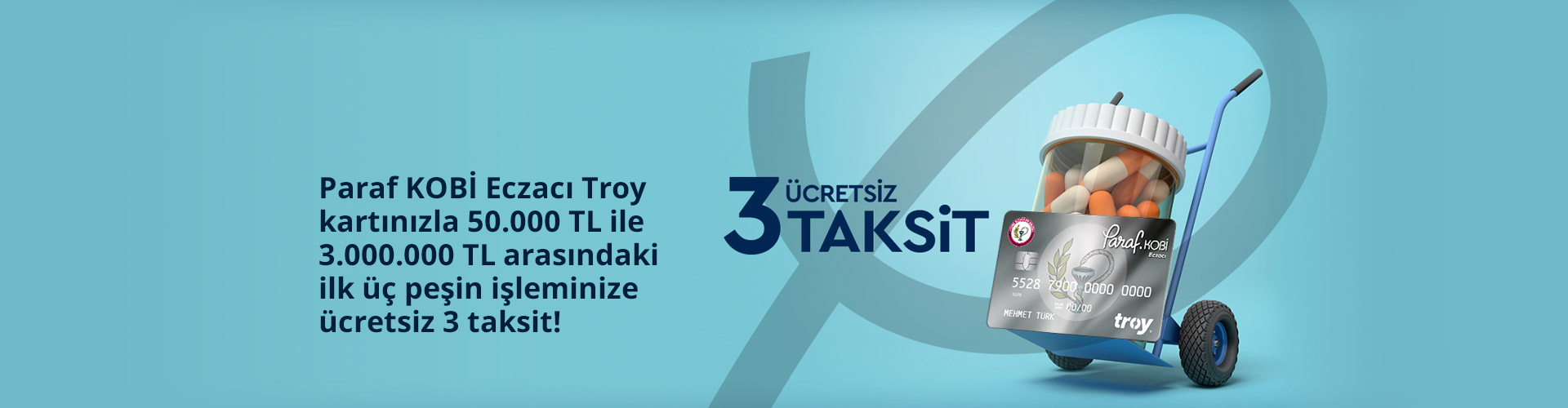 - 31 Mayıs 2025 tarihine kadar Eczacı Paraf KOBİ Troy kredi kartınız ile POS üzerinden TİCARİ MENÜ seçilerek yapılacak İŞLEMLER HARİÇ tüm yurt içi banka POS’larından 50.000 TL ile 3.000.000 TL arasındaki ilk üç peşin harcamanız ücretsiz 3 taksite bölünecektir.
