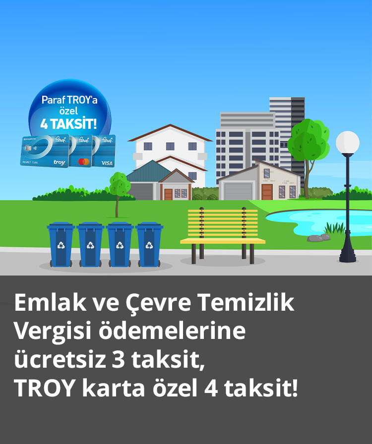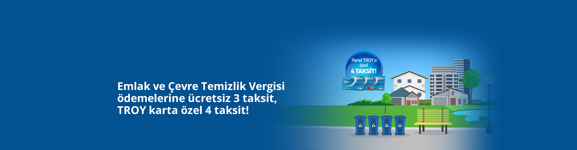 - 1 Kasım - 3 Aralık 2025 tarihleri arasında yapılacak 500 TL ve 1.250.000 TL arasındaki peşin Emlak ve Çevre Temizlik Vergisi ödemeleri TROY logolu kartlar için masrafsız olarak 4 taksite, diğer kartlar için masrafsız olarak 3 taksite bölünecektir.