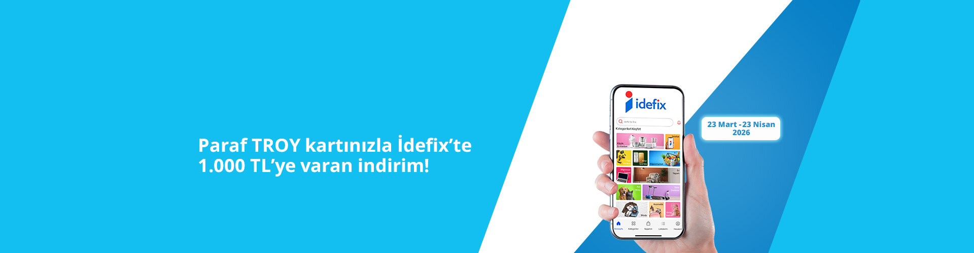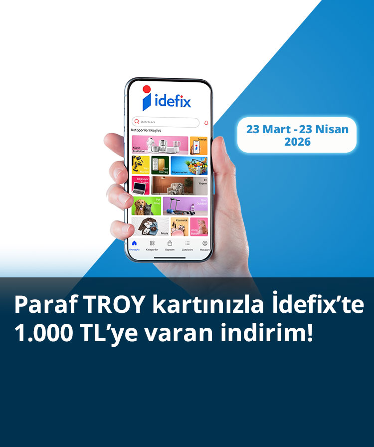 - Kampanya döneminde, TROY logolu bireysel ve ticari kredi kartı, banka kartı ve ön ödemeli kartlar ile idefix’te tek seferde yapılacak 1.000 TL ve üzeri alışverişlerde 200 TL, toplam 1.000 TL indirim sağlanacaktır.