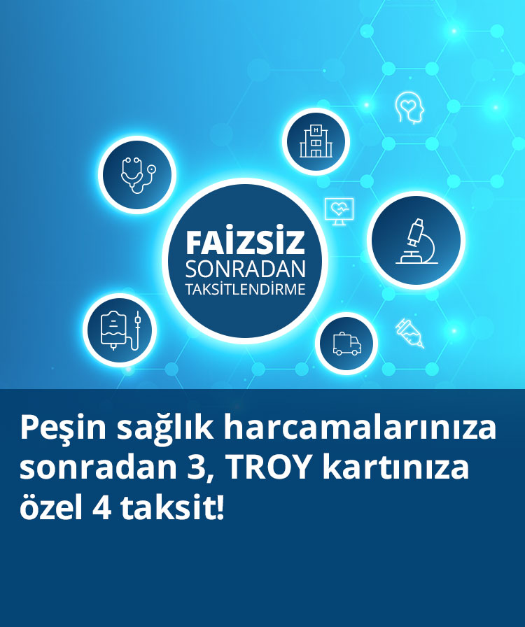 - Sağlık harcamalarınıza özel faizsiz sonradan taksitlendirme işlemi sadece 3 ve 4 taksit seçeneğinde geçerli olup, diğer sonradan taksit seçeneklerinde cari faiz oranı geçerli olacaktır.