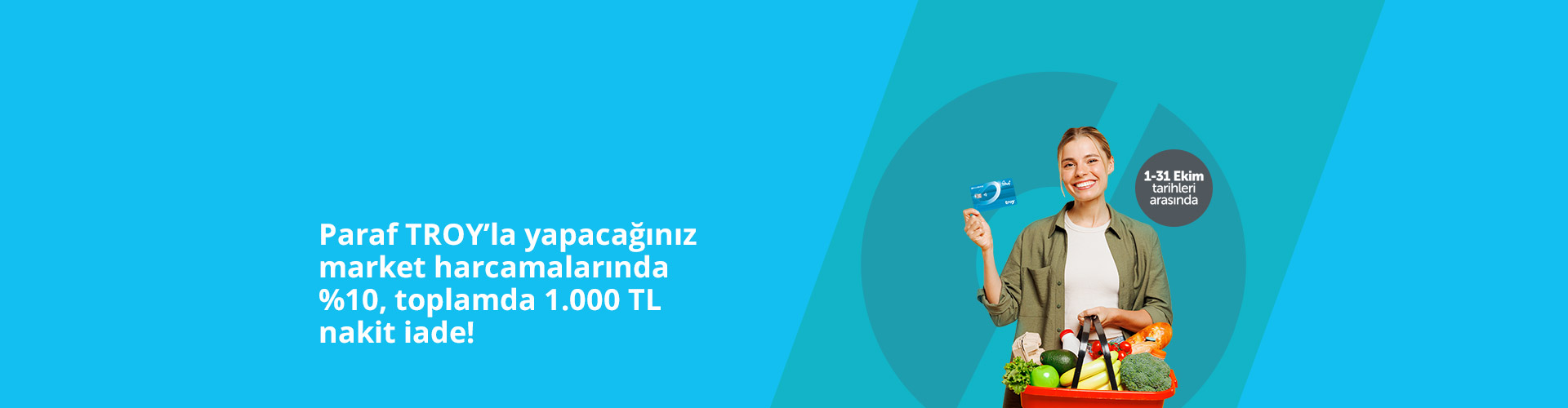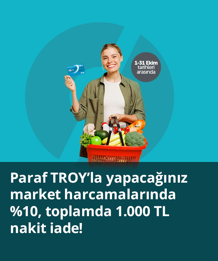 - 1-31 Ekim 2025 tarihleri arasında yurt içi gıda marketlerinde Paraf TROY logolu bireysel banka kartı, kredi kartı veya ön ödemeli kartlar ile yapılan tüm market harcamalarına %10,toplamda 1.000 TL nakit iade verilecektir.