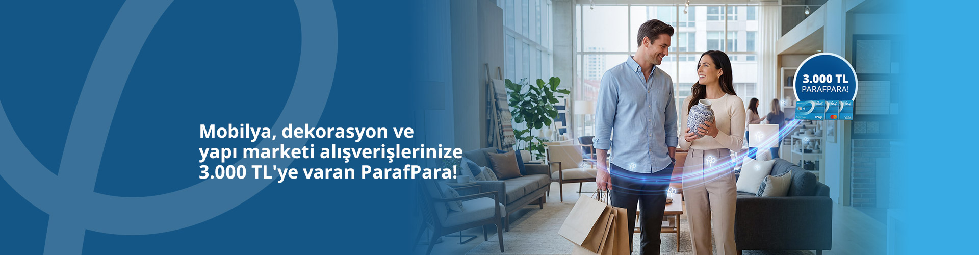 - 1-30 Nisan 2026 tarihlerinde yurt içi mobilya, dekorasyon ve yapı marketi sektörlerinde tek seferde yapılacak 30.000 TL ile 99.999 TL arasındaki ilk harcamaya 1.500 TL, 100.000 TL ve üzerindeki ilk harcamaya 3.000 TL ParafPara verilecektir.